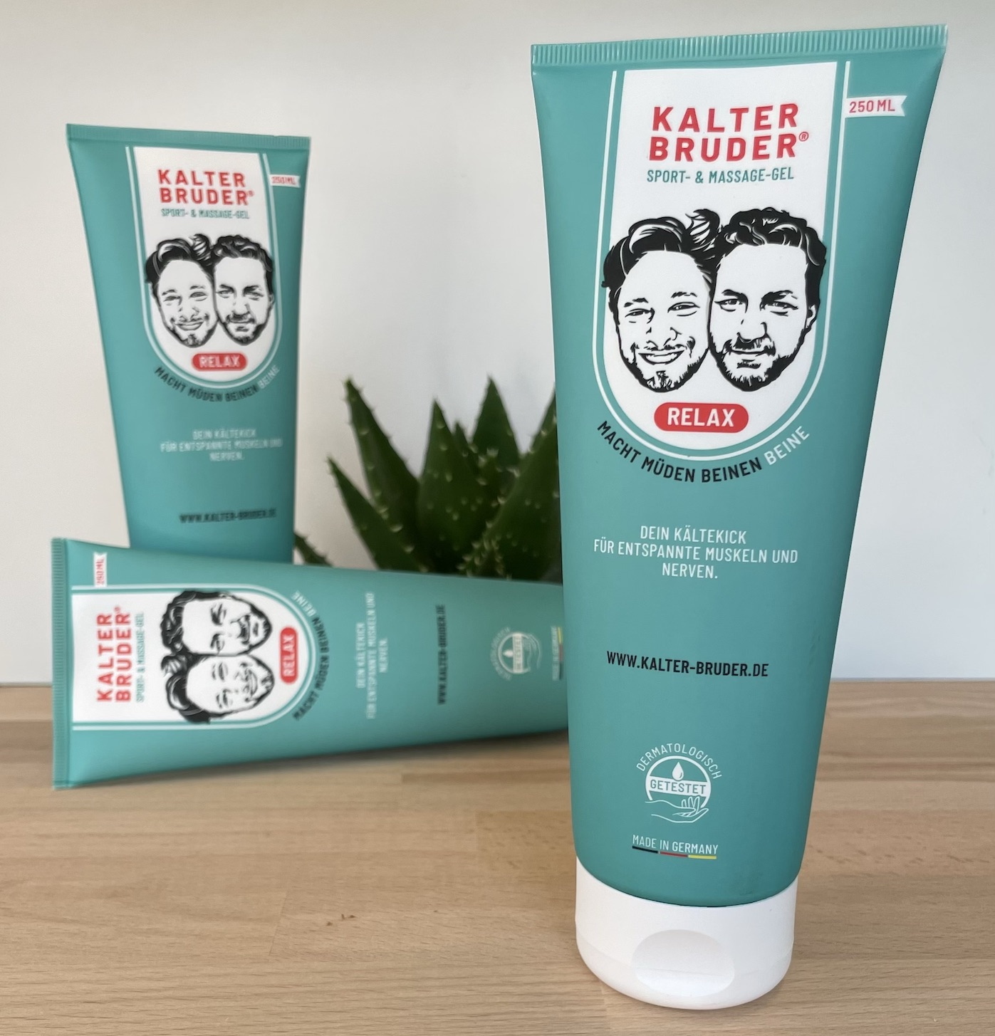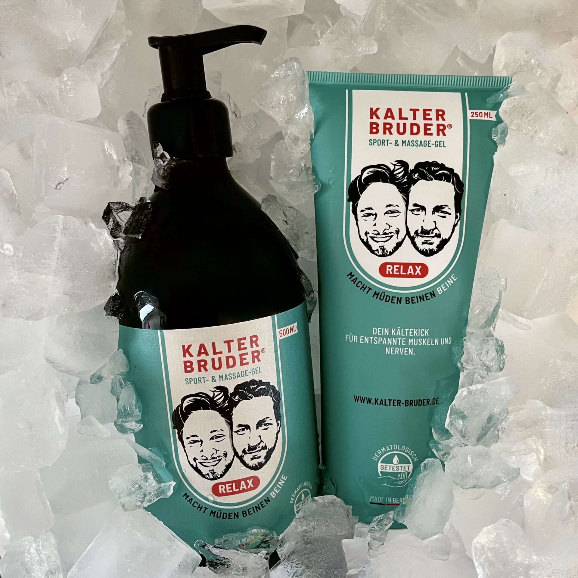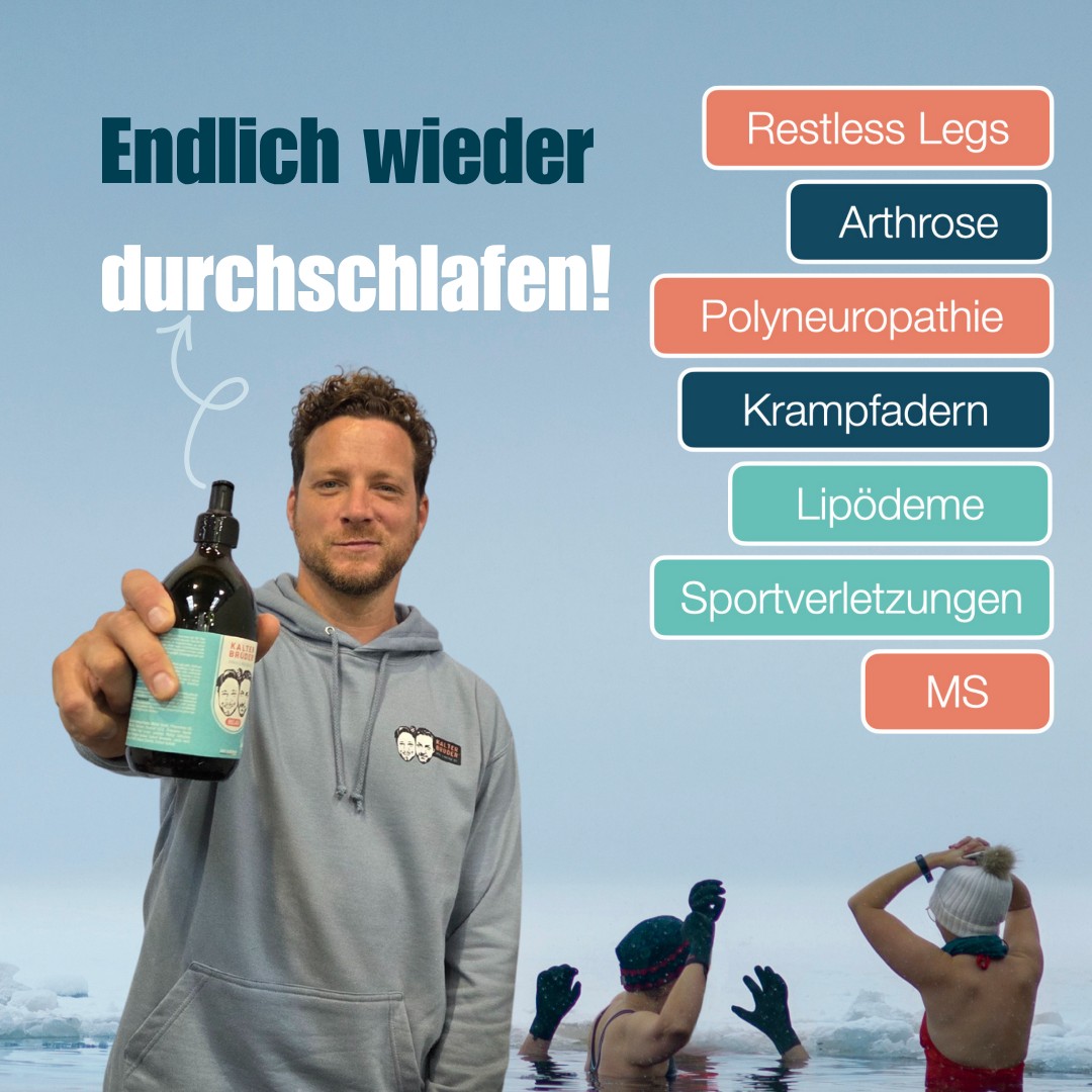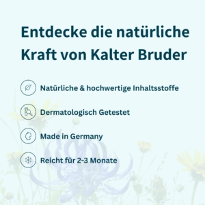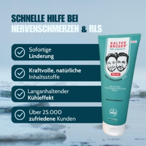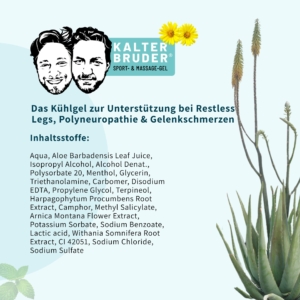 “Kalter Bruder®”, ein kühlendes Sport- und Massagegel, das von den Zwillingsbrüdern, Carsten und Stefan aus Lüneburg entwickelt wurde. Es besteht aus natürlichen Heilpflanzen wie Aloe Vera, Arnika, Teufelskralle, Menthol und Kampfer, die schmerzlindernde, entzündungshemmende und entspannende Eigenschaften haben. Das Gel bietet einen langanhaltenden, tiefgreifenden Kühleffekt und wird zur Linderung von Beschwerden wie Restless Legs, Polyneuropathie, Arthrose, MS, Krampfadern, Lipödemen, Gelenkentzündungen und Sportverletzungen eingesetzt.