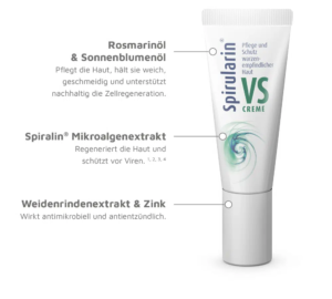 Der patentierte Mikroalgen-Aktivschutz Spiralin® regeneriert die Haut und bietet einen wirksamen Schutz vor Viren. Er legt sich wie ein schützender Film um gesunde, nicht infizierte Hautzellen und hilft, diese vor einer Ansteckung zu bewahren. Bei regelmäßiger Anwendung bleiben die gesunden Hautzellen geschützt, bis infizierte Hautzellen durch den natürlichen Hauterneuerungsprozess vollständig ersetzt sind.